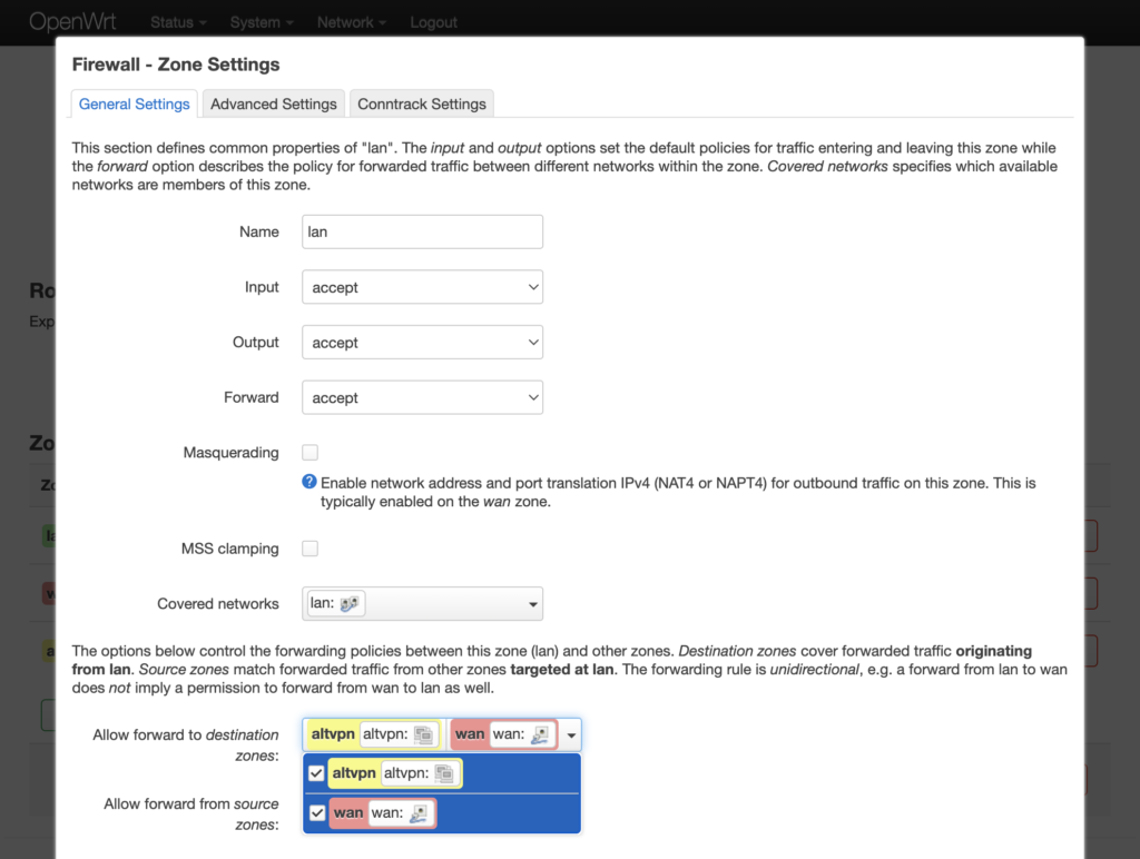 Добавить в allow forward to destination zones новую зону altvpn и сохранить изменения